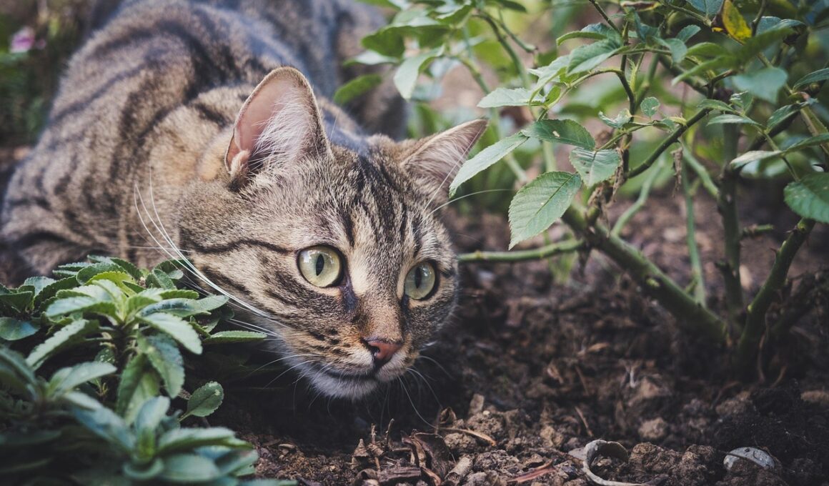 Being aware of your outdoor environment is essential when allowing your cat to play freely. As an owner, you should regularly assess the safety of the yard or play area. Areas exposed to high traffic, loud noises, or erratic movements may induce anxiety in your cat. Additionally, consider nearby wildlife; some animals may pose a threat to your feline friend while playing outdoors. Monitor the area for signs of dangerous wildlife and clear any clutter that might harbor unwanted critters. Always check for hidden dangers, such as unsteady surfaces, thorn bushes, or wet spots that can become slippery. Furthermore, when using toys that require movement or running, be aware of your cat’s stamina and energy limits. They may tend to overextend themselves, leading to exhaustion. Do not hesitate to intervene and progress gradually as your cat acclimates. Sometimes, limiting time outdoors can extend overall play enjoyment, keeping excitement high. Consider creating diversionary tactics using cat-friendly call signals or treats that can guide them when it’s time to return indoors. Understanding comprehensively enhances their playful exploration while ensuring maximum enjoyment in outdoor settings.